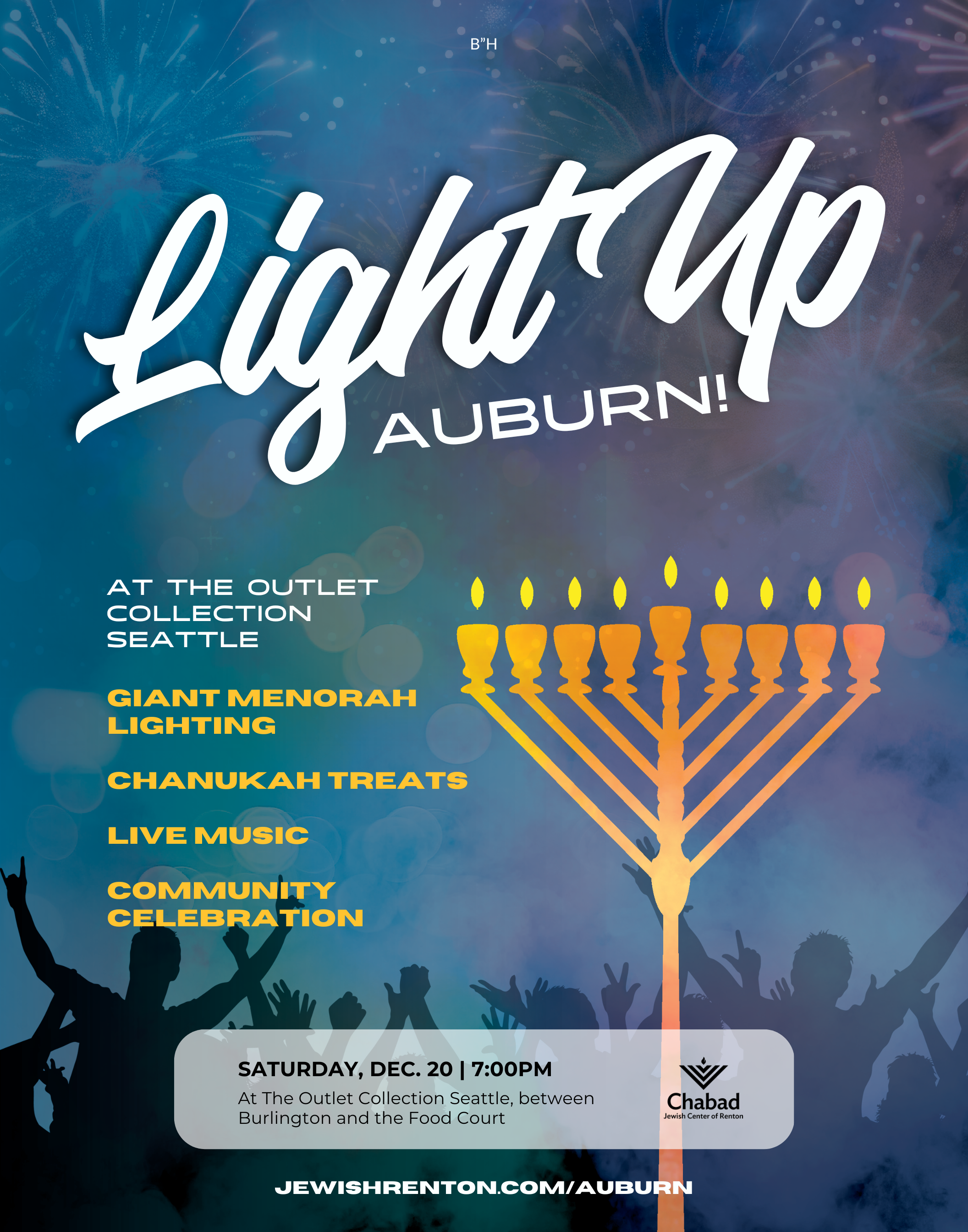 This Chanukah, as each year, we are increasing in light. In addition to the annual Chanukah @ The Landing, giant Menorahs around Renton, and the Happy Chanukah billboards across Renton and Kent, join us on the 7th night to LIGHT UP AUBURN!