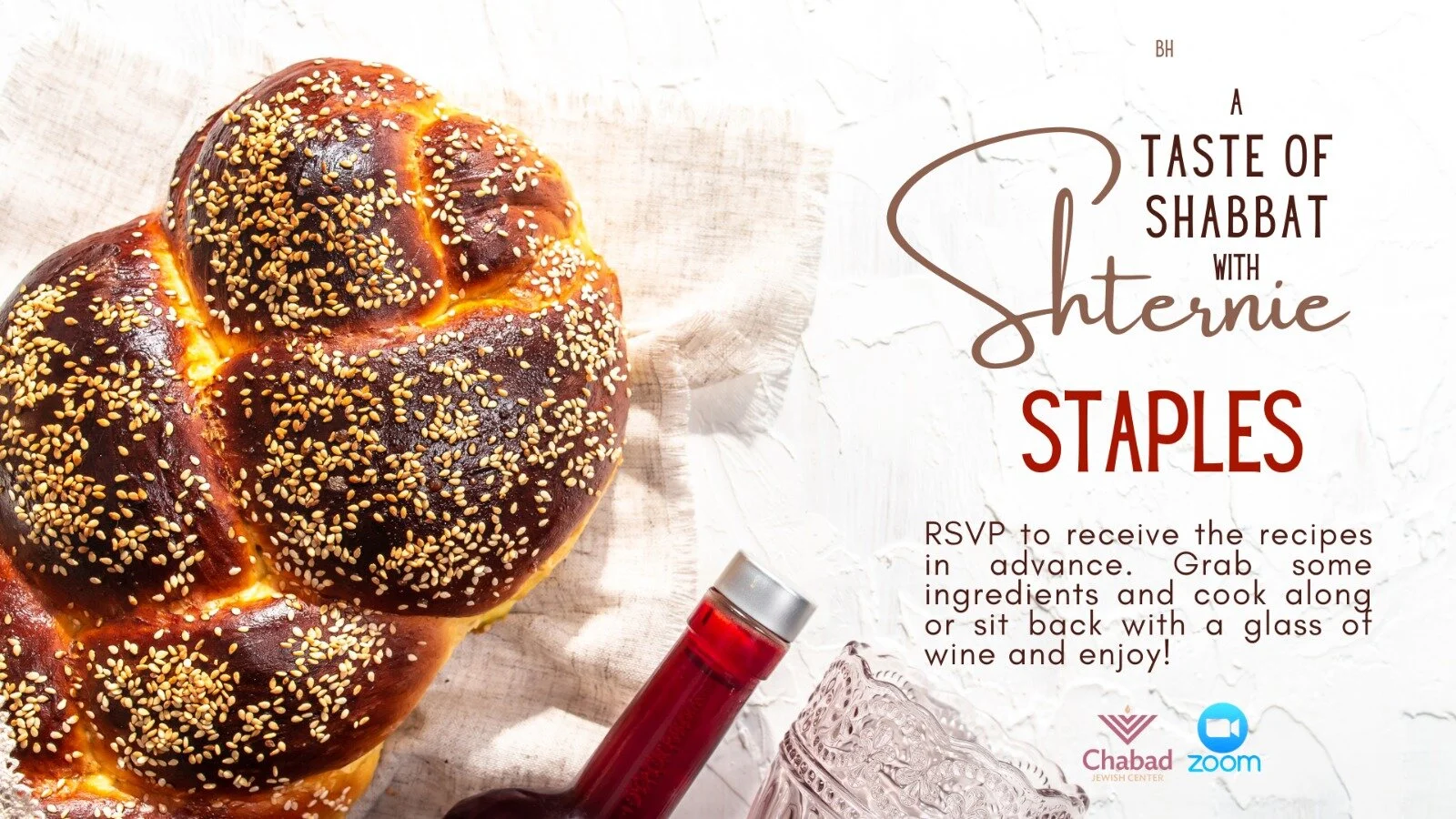 Join Shternie in her kitchen from the comfort of yours for a series of Shabbat cooking demos via Zoom. Cook along or pour yourself a glass of wine, sit back, and enjoy.